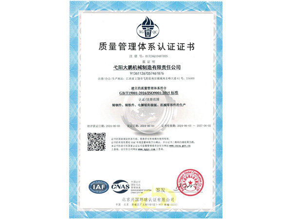公司順利通過質量管理體系認證、環境體系認證、職業健康安全管理體系認證、環評。2015年5月獲國家工信委頒發的《鑄造企業準入條件》;2019年做了安全現狀評價;2020年取得了排污許可證。